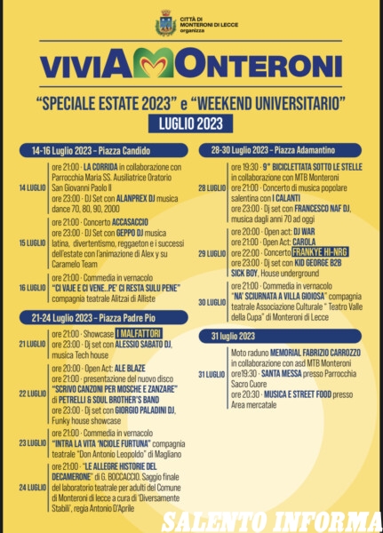 Concerti dal vivo, teatro, dj set e tanto divertimento! Prende il via venerdì 14 luglio la rassegna ViviAMOnteroni, Speciale estate 2023 e Week end universitario, organizzata dal Comune di Monteroni di Lecce, Assessorato alla Cultura.
