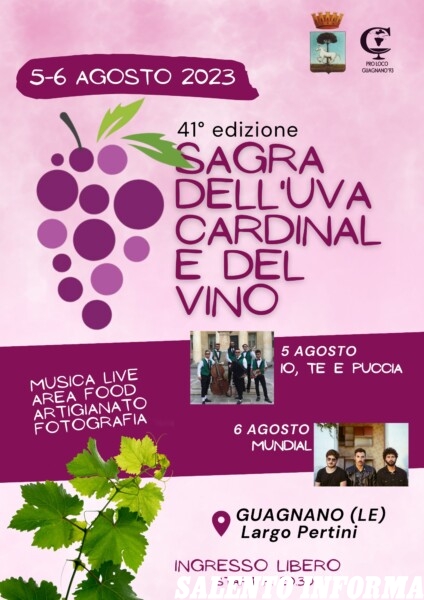 Due serate di buona musica, dj-set, divertimento e delizie enogastronomiche locali, a firma della Pro Loco Guagnano ‘93 APS con la collaborazione del Comune di Guagnano. Sabato 5 agosto sul palco di Largo Pertini saliranno Io, te e Puccia, mentre domenica 6 agosto toccherà ai Mundial. E nella mattinata di domenica, l’evento nell’evento: la raccolta live dell’uva Cardinal nelle campagne del paese, tutti insieme a far festa come un tempo.