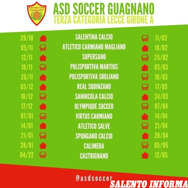 Il primo appuntamento è per domenica 29 ottobre al ‘Carmen Longo’ contro la Salentina Calcio, squadra di Copertino al debutto nel torneo, mentre l’ultima gara del girone di andata si disputerà a Castrignano de’Greci (proprio come lo scorso torneo).