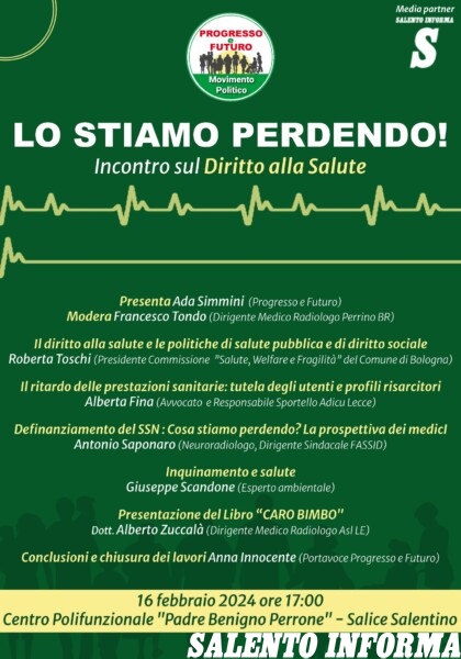Venerdì 16 Febbraio all ore 17:00, presso il Centro Polifunzionale “Padre Benigno Perrone” a Salice Salentino, si terrà l’incontro sul Diritto alla Salute “Lo Stiamo Perdendo!” a cura del Movimento Progresso e Futuro.