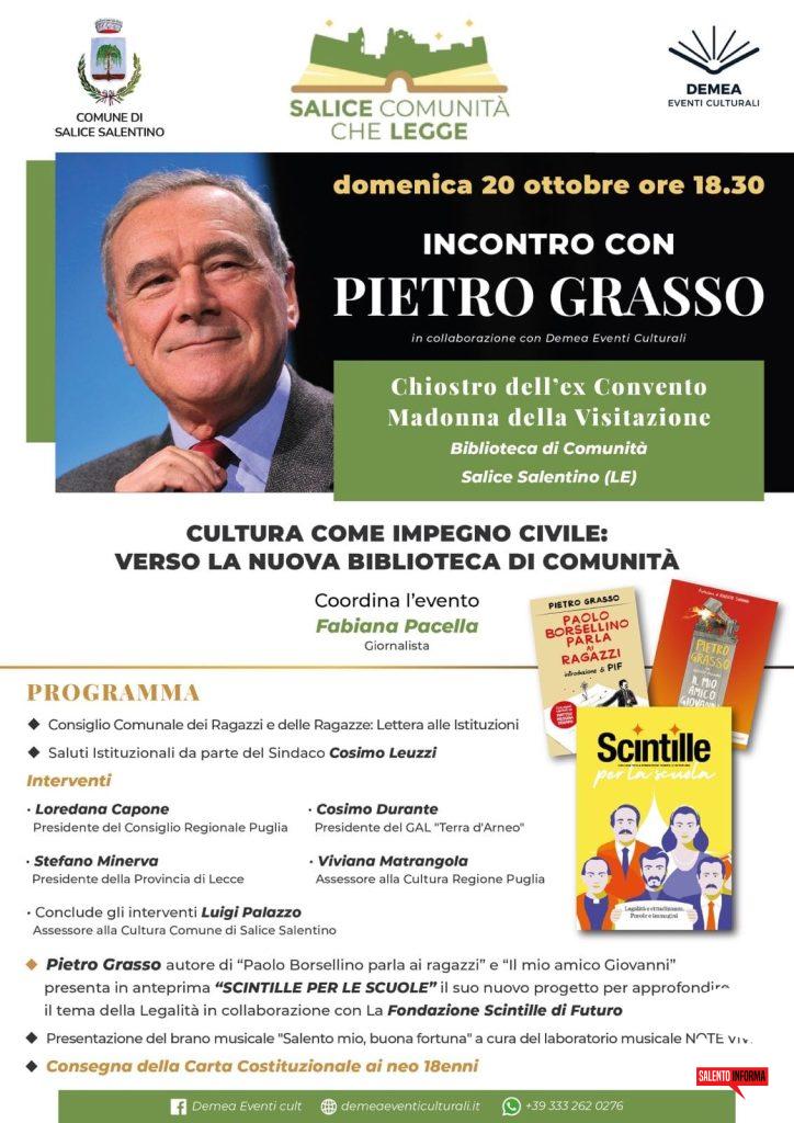 La rassegna culturale “Salice Comunità che Legge” in collaborazione con Demea Eventi Culturali ospita Pietro Grasso, magistrato già procuratore nazionale antimafia, che presenterà in anteprima il suo ultimo libro dal titolo “Scintille per la scuola – Legalità e cittadinanza. Parole e immagini”.