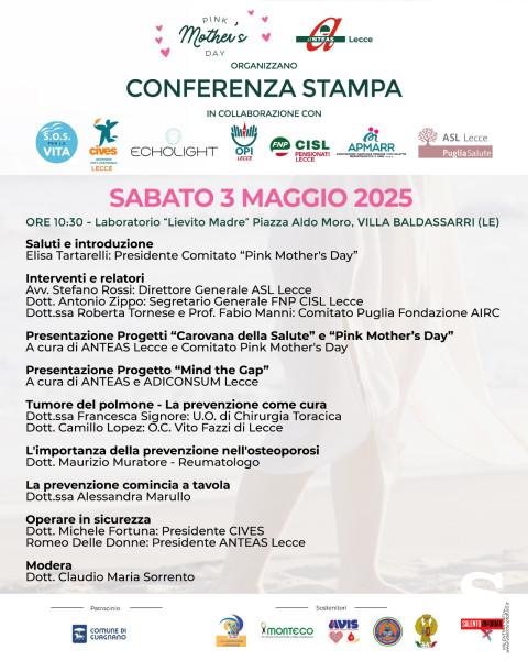 Una mattinata dedicata alla salute, alla prevenzione e all’empowerment femminile si terrà sabato 3 maggio alle ore 10:30 presso il Laboratorio “Lievito Madre” in Piazza Aldo Moro, a Villa Baldassarri, con la conferenza stampa organizzata dal Comitato “Pink Mother’s Day” e da ANTEAS Lecce.