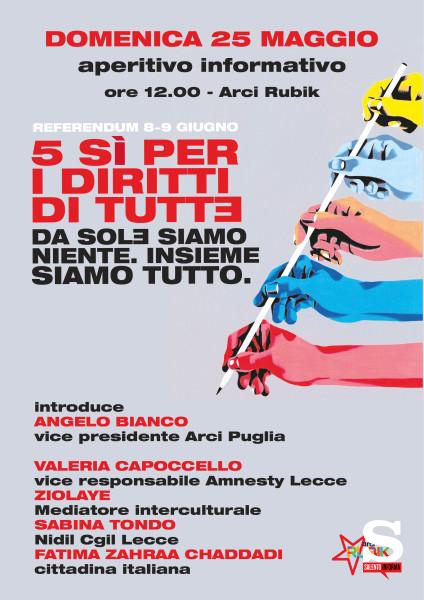 Domenica 25 maggio, a partire dalle ore 12.00, Arci Rubik ospiterà un incontro informativo volto a sensibilizzare la cittadinanza sull’importanza del prossimo appuntamento referendario dell’8 e 9 giugno. L’iniziativa si terrà nel piazzale dell’associazione in via Cellino 5 e sarà seguita da un aperitivo musicale.