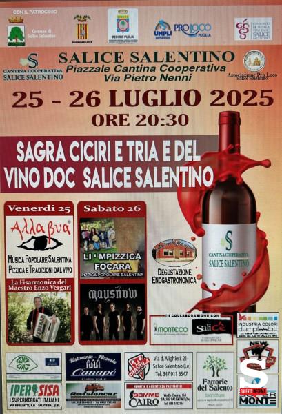 Salice Salentino si prepara a vivere due serate all’insegna del gusto, della cultura e della tradizione con il ritorno della Sagra del Vino DOC e Ciciri e Tria, in programma il 25 e 26 luglio 2024, a partire dalle ore 20.30, presso il piazzale della Cantina Cooperativa.