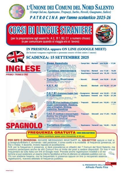 L’Unione dei Comuni del Nord Salento — composta da Campi Salentina, Squinzano, Trepuzzi, Surbo, Novoli, Guagnano e Salice — ha avviato le iscrizioni ai nuovi corsi di lingue straniere per l’anno scolastico 2025-2026, con frequenza gratuita aperta a tutti i cittadini del territorio.