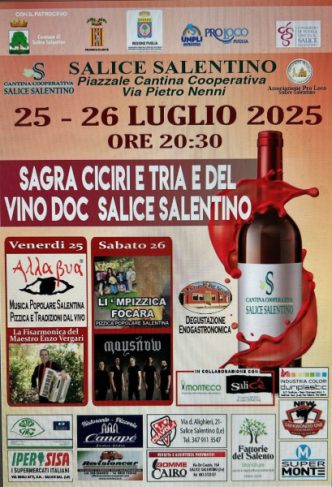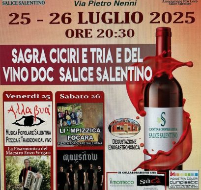 Spettacolo Salice Salentino: il 25 e 26 luglio torna la sagra del vino Doc e ciciri e tria byRedazioneLuglio 23, 2025
